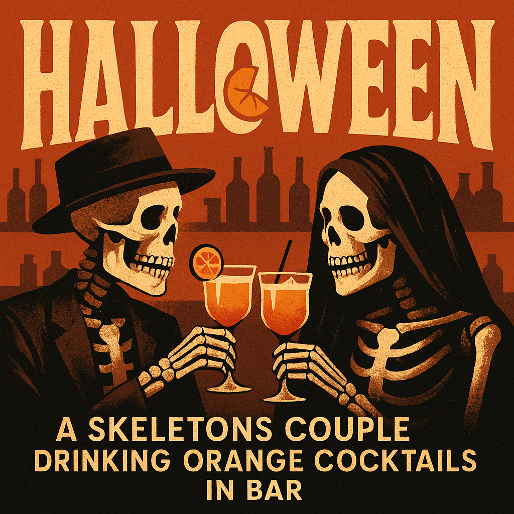 /Collection: /by davooda/Type: PNG/A playful Halloween illustration featuring a skeleton couple toasting with orange cocktails in a bar setting. The bold colors and vintage style make it ideal for festive decorations or themed events.