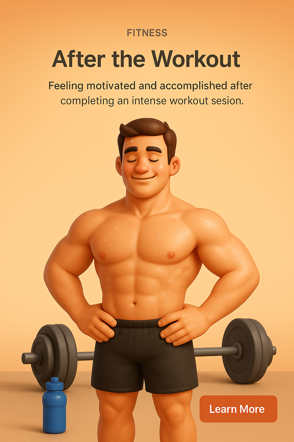 /Collection: /by davooda/Type: PNG/A 3D illustration of a fit man standing confidently after a workout session, surrounded by a barbell and water bottle. The background features a smooth gradient, enhancing the motivational theme.