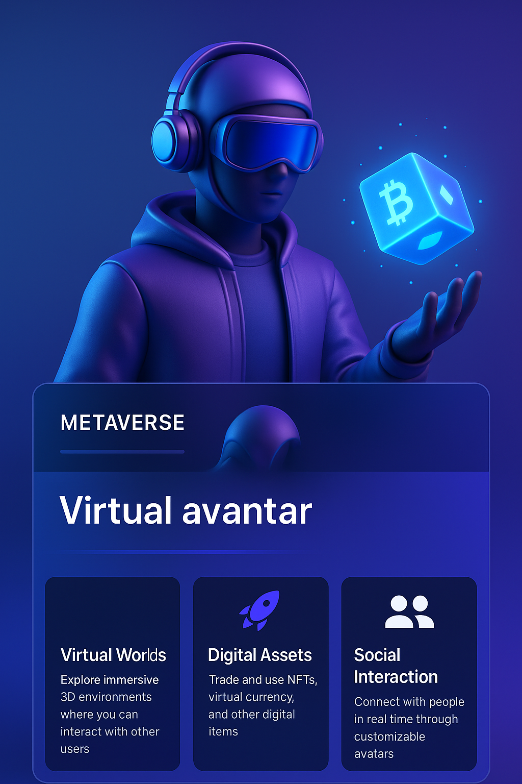 /Collection: /by davooda/Type: PNG/A futuristic 3D avatar in a hoodie holds a glowing crypto cube, set against a smooth gradient background. The design features interactive elements for a virtual experience.
