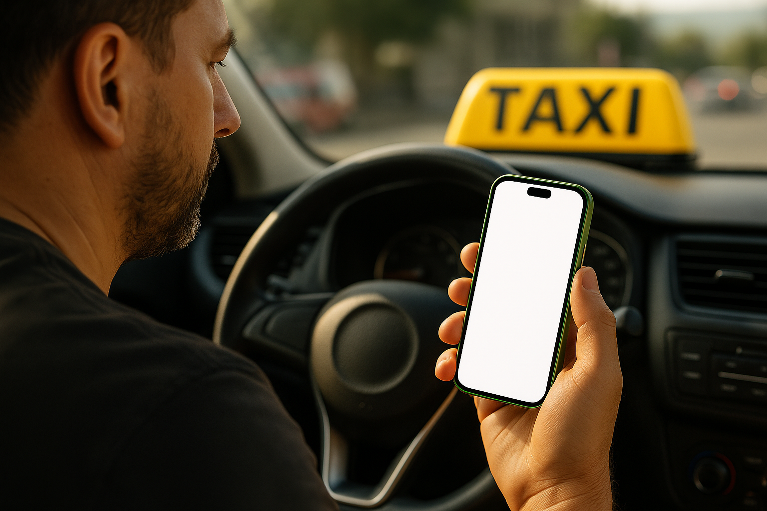 A taxi driver is seated in his vehicle, holding a green phone with a blank screen. The taxi sign is visible on the dashboard, creating a clear taxi environment.