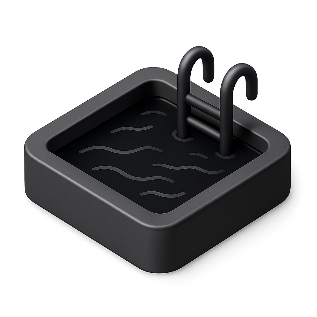 A sleek 3D icon depicting a dark pool with a smooth surface and an isometric perspective. The design features a minimalistic pool with gentle waves and a ladder.