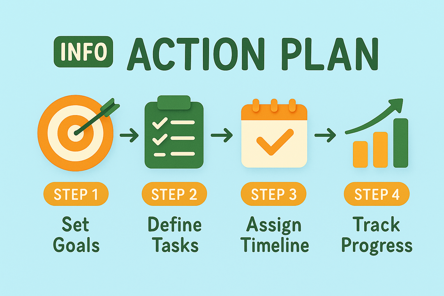 Colorful infographic illustrating a four-step action plan process, ideal for project management and goal-setting presentations with a clear and engaging design.