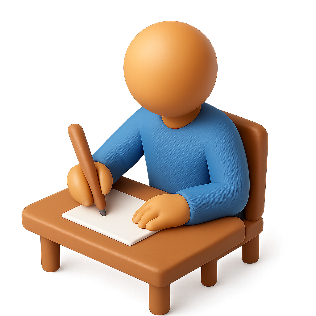 /Collection: /by davooda/Type: PNG/A 3D icon depicting a simplistic figure sitting at a table, writing on a piece of paper. The figure has a rounded head and a blue shirt, rendered in an isometric view with a volumetric feel.