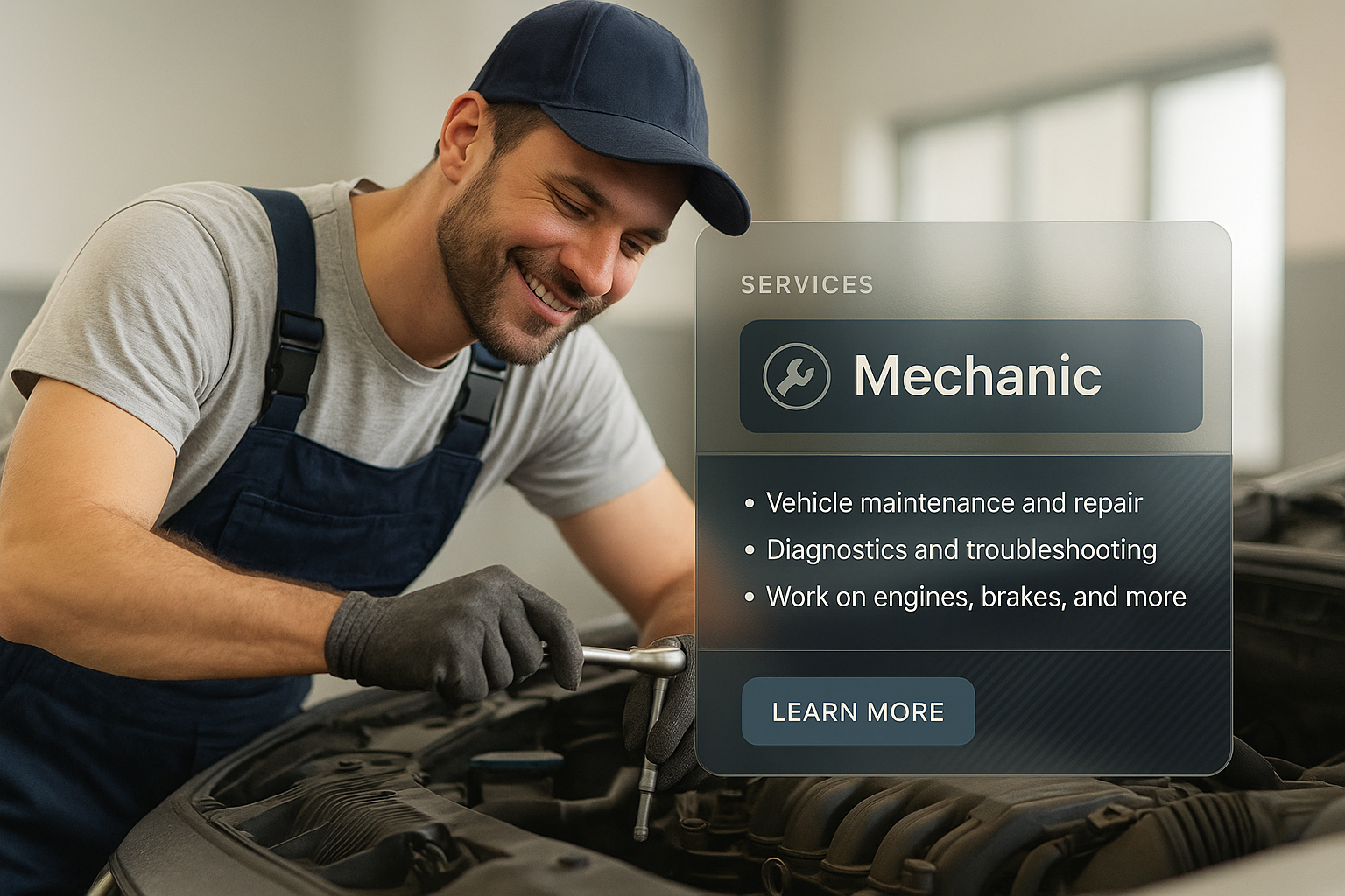 /Collection: /by davooda/Type: PNG/A mechanic works on a vehicle with tools. The image features an integrated service block displaying services offered, including diagnostics, engine work, and more.