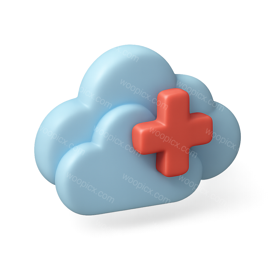 A visually appealing 3D cloud icon featuring overlapping clouds in soft blue tones, with a prominent red plus sign in the center, presented on a gradient background.