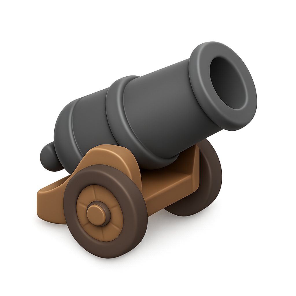 A visually appealing 3D cannon icon presented in a three-quarter isometric view, featuring a dark barrel and wooden wheels, set against a gradient background.