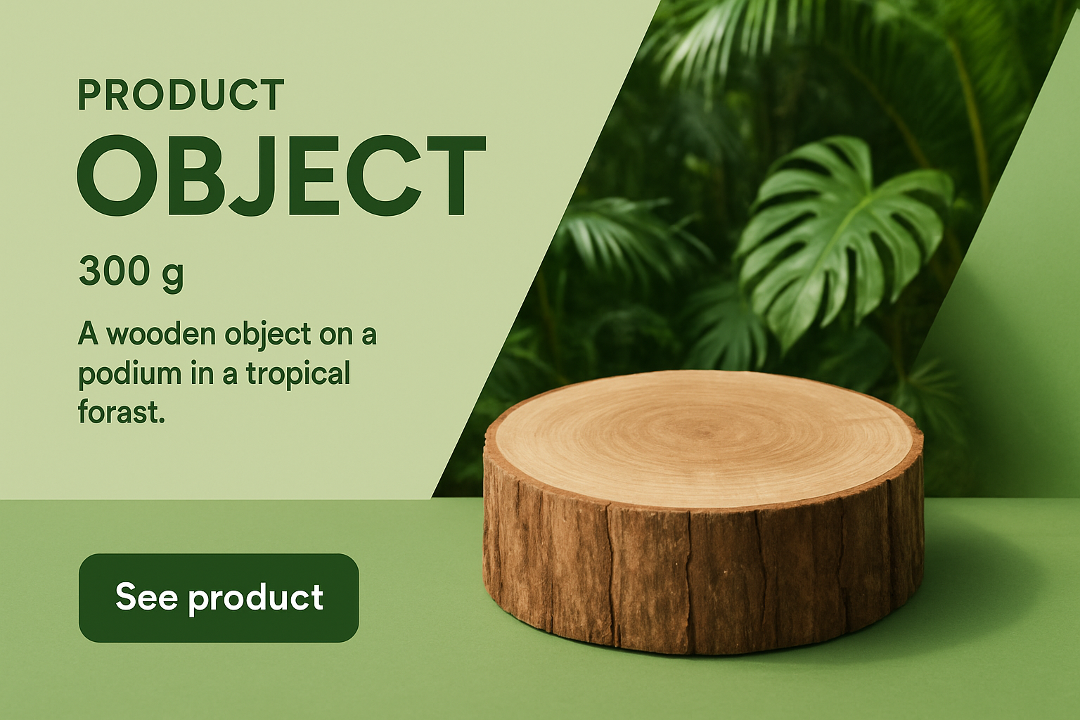 A wooden podium set against a vibrant tropical forest backdrop, featuring contrasting colors. The design highlights a product, complete with bold typography and a clear call to action.