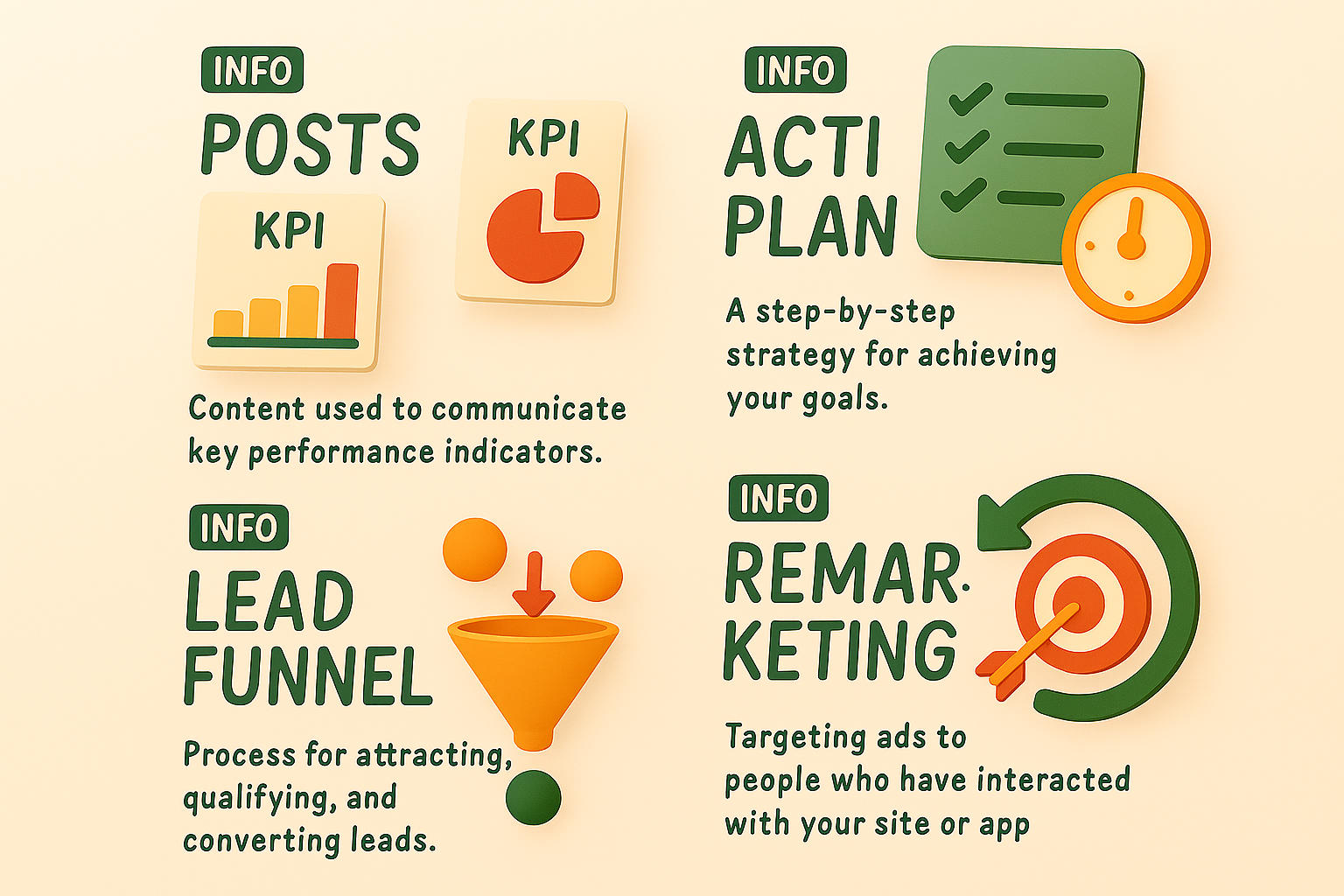 /Collection: /by davooda/Type: PNG/Colorful infographic detailing key marketing concepts such as posts, lead funnel, and remarketing, designed to educate and inform audiences about performance indicators.