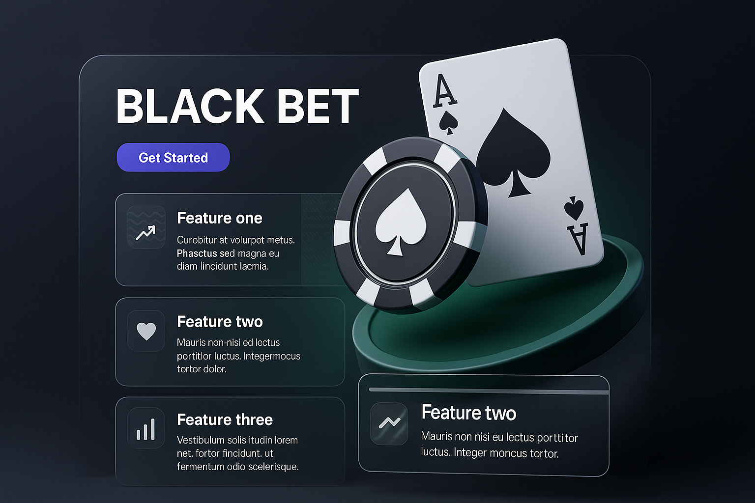 /Collection: /by davooda/Type: PNG/An engaging 3D web page layout showcasing the 'Black Bet' theme. It features a playing card and chip against a smooth gradient background, highlighting various features.