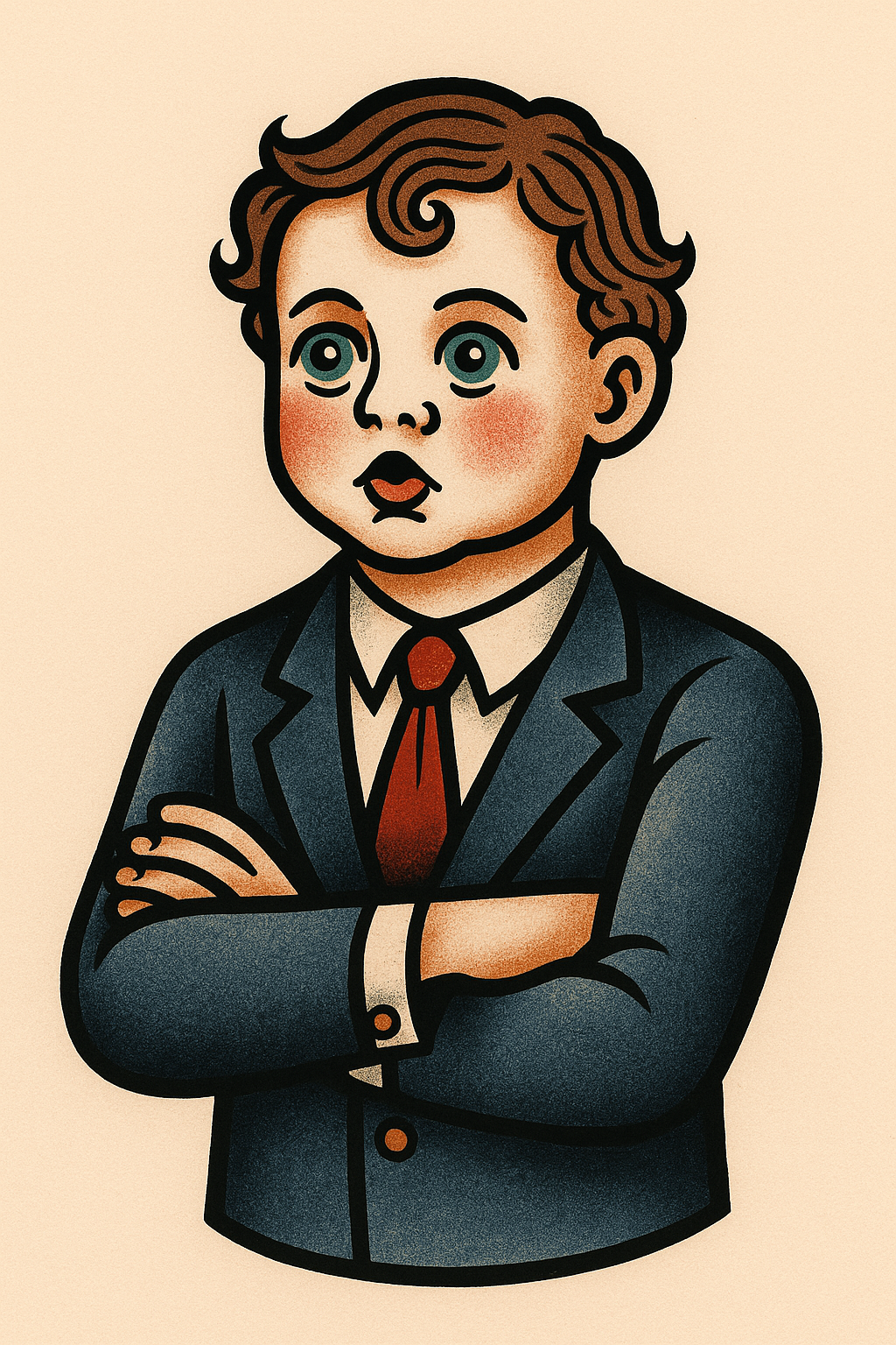 This image showcases a classic tattoo design depicting a child in a suit, embodying a sense of innocence and maturity. The background features a soft beige tone.