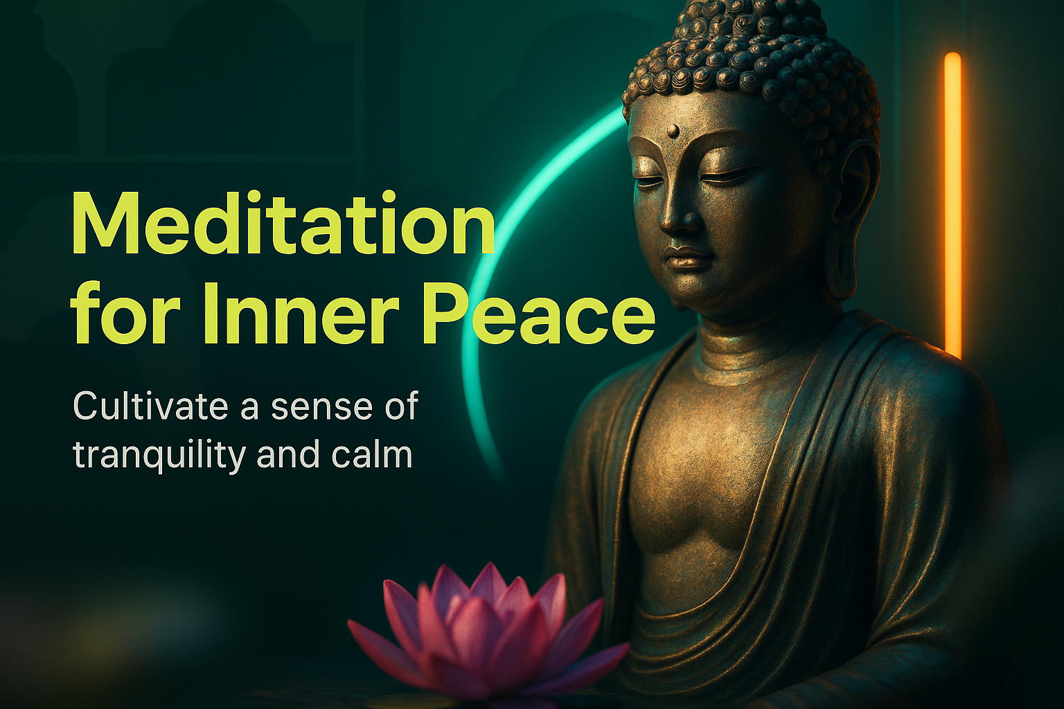 /Collection: /by davooda/Type: PNG/A serene meditation-themed graphic featuring a Buddha statue and a lotus flower, designed to evoke feelings of tranquility and calm, suitable for wellness and mindfulness promotions.