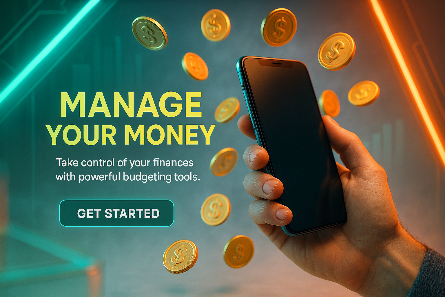 Vibrant promotional graphic for a finance management app featuring a hand holding a smartphone amidst floating coins. Ideal for digital marketing and app promotion.