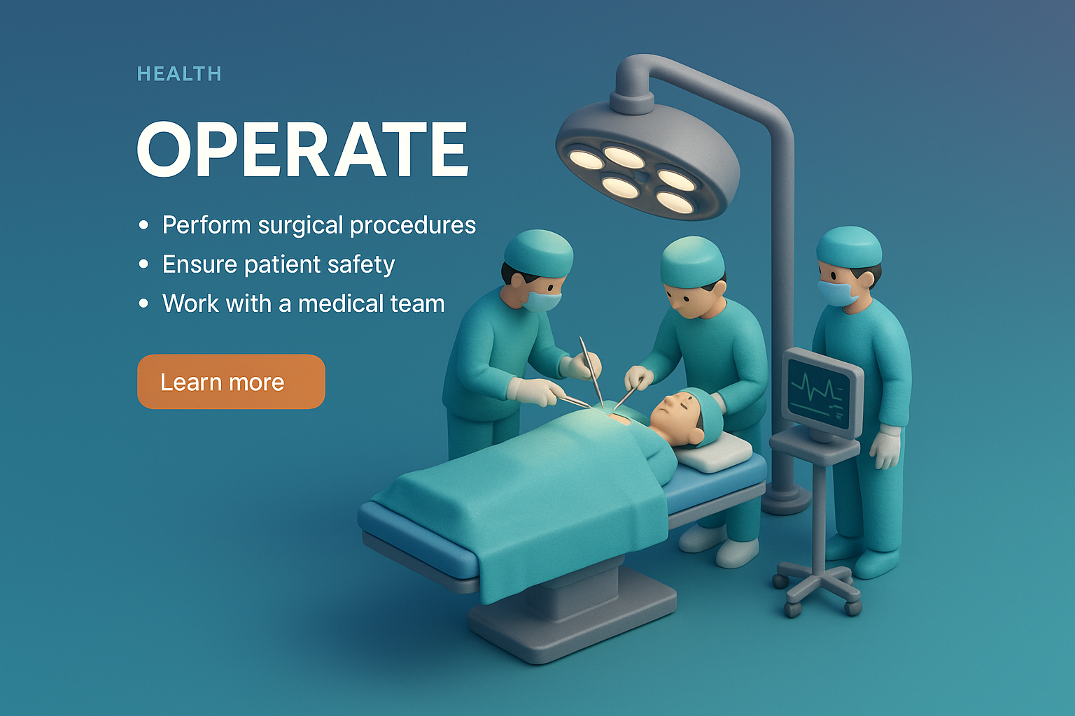 /Collection: /by davooda/Type: PNG/A realistic 3D scene depicting a surgical operation with small characters performing tasks. The backdrop features a smooth gradient, and clear text elements guide the viewer through the scene.
