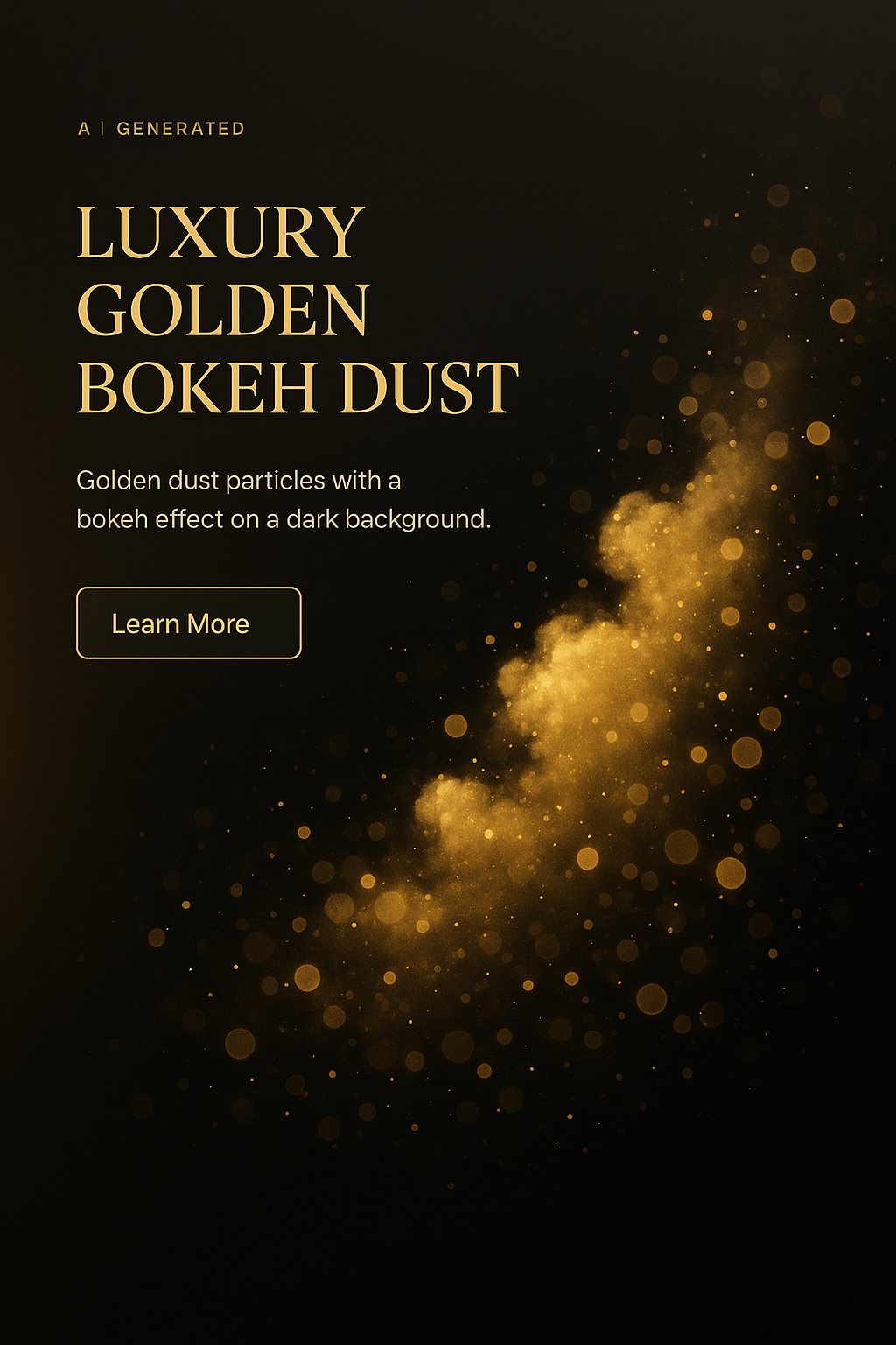 A visually stunning illustration featuring luxury golden dust particles with a bokeh effect against a dark backdrop. The design includes text elements and a call-to-action button.