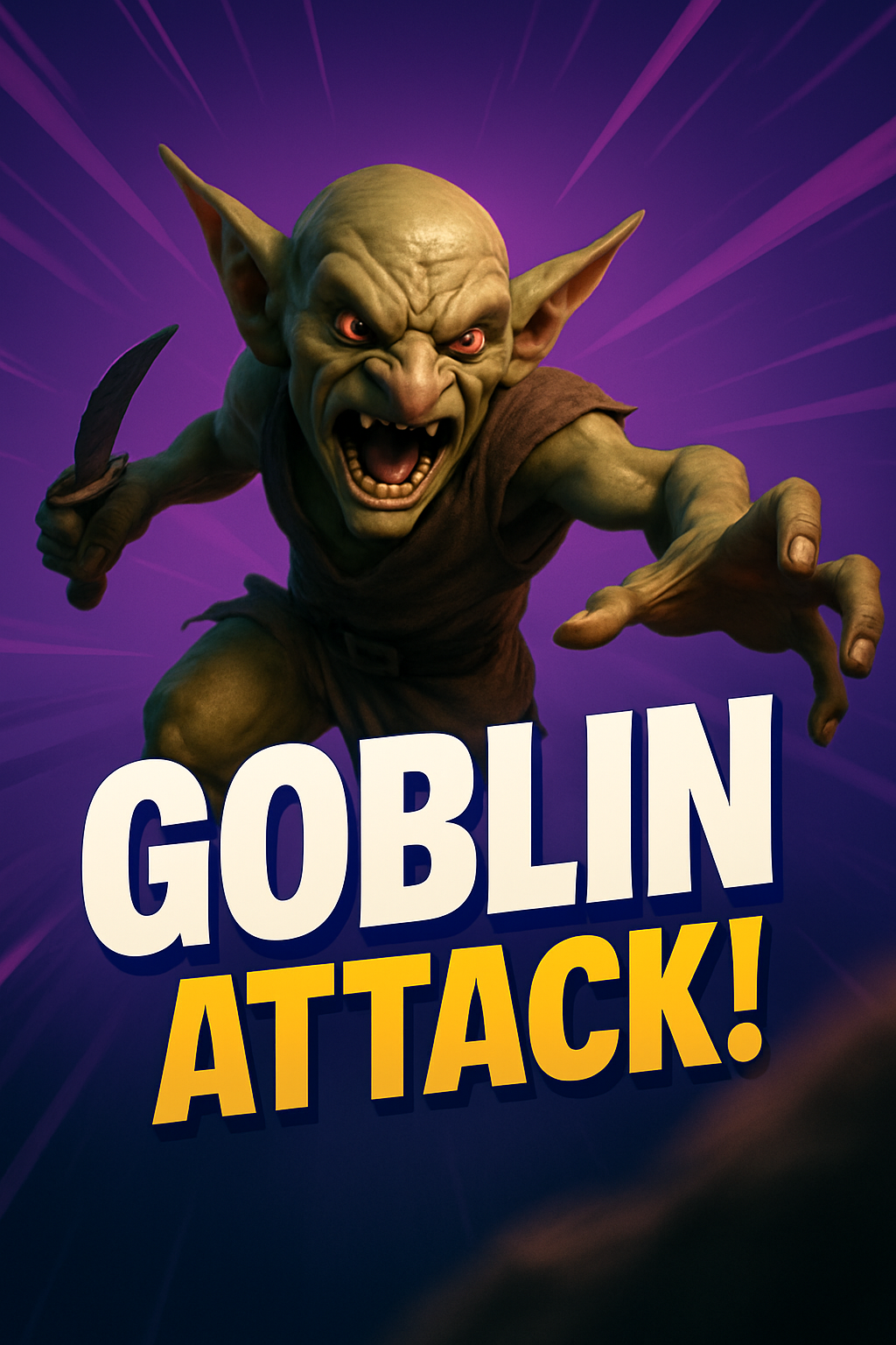 A fierce goblin character leaping forward with a weapon, set against a vibrant gradient background. The dynamic lines emphasize movement, creating an intense scene.
