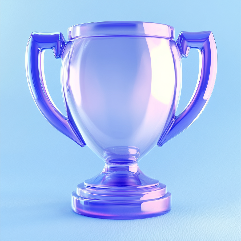A sleek, stylized trophy rendered in transparent purple with a smooth finish, set against a light blue background. Ideal for award-related themes in digital graphics.