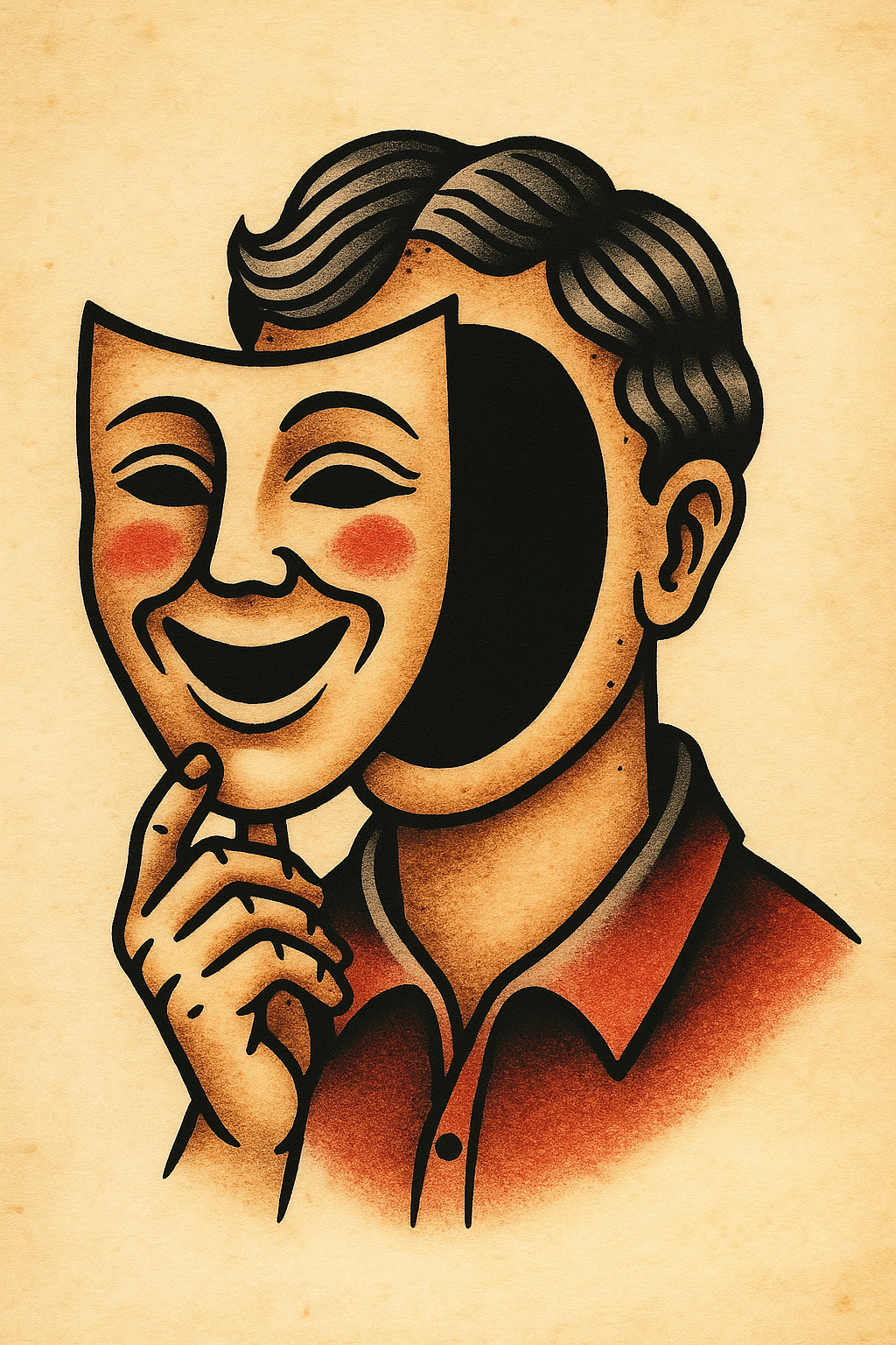 A person holds a smiling mask, revealing emptiness underneath. This tattoo design features classic colors on a light beige background, showcasing emotional contrast.