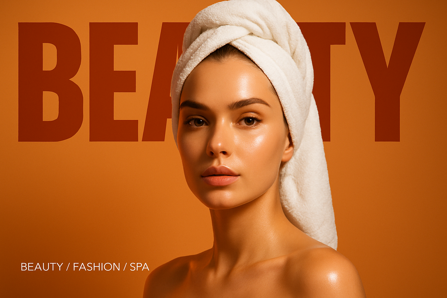 A striking minimalist portrait of an attractive woman with a towel, set against a warm gradient background. The bold word 'BEAUTY' dominates the upper half, emphasizing modern aesthetics.