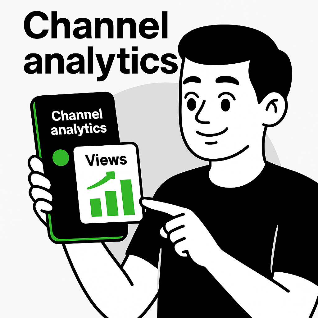 /Collection: /by davooda/Type: PNG/A minimalist illustration depicting a person holding a smartphone displaying channel analytics, showcasing view trends with an upward graph. Ideal for digital marketing content and social media posts.