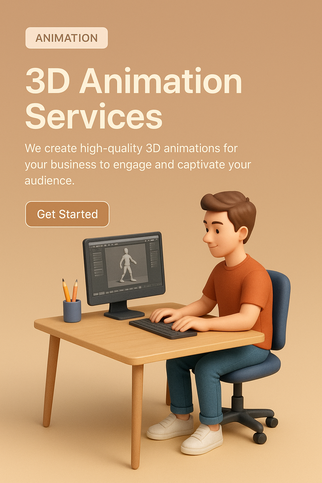 A realistic 3D illustration featuring a young man at a desk, working on a computer with an animation program. The background has a smooth gradient, creating an inviting atmosphere.