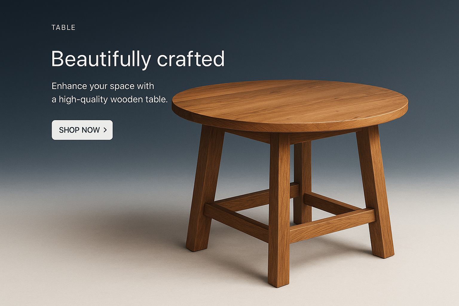A sleek web page design showcasing a beautifully crafted wooden table. The layout features a gradient background and concise text highlighting the product's quality and a call-to-action button.
