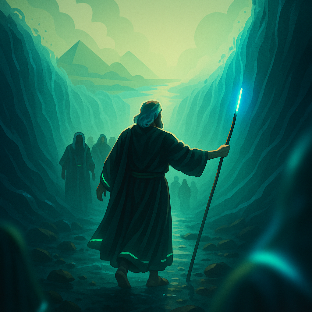 Dramatic Illustration of a Biblical Scene with Parting Waters