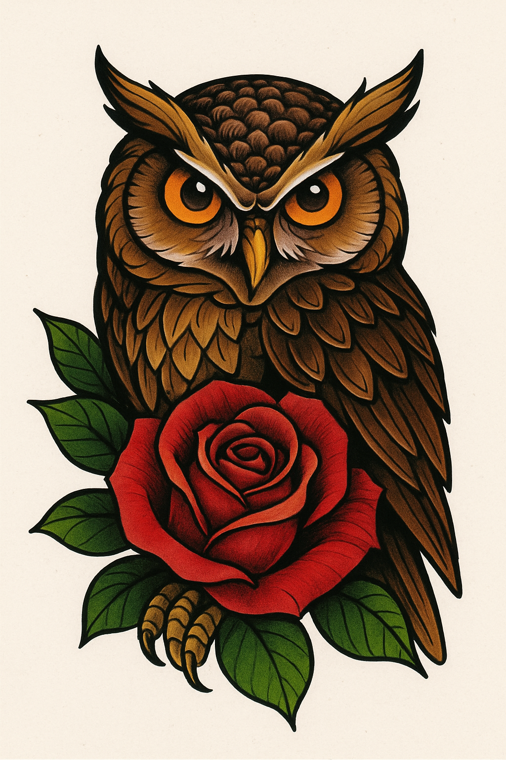 Vibrant and detailed tattoo design featuring an owl perched on a rose, showcasing bold colors and intricate line work, ideal for tattoo enthusiasts and artists.