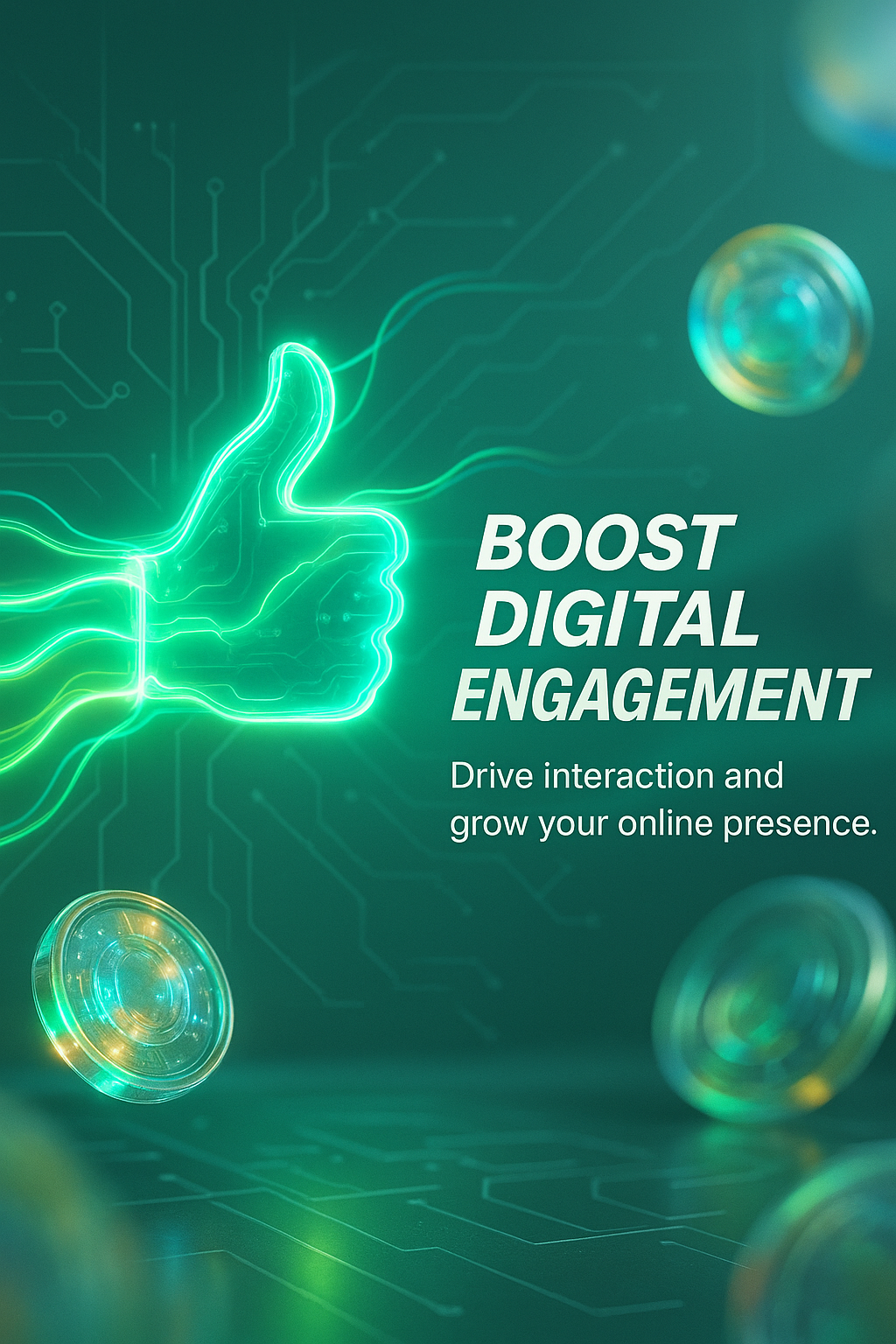 Modern promotional graphic featuring a glowing thumbs-up symbol against a tech-inspired background, ideal for social media marketing and digital campaigns.