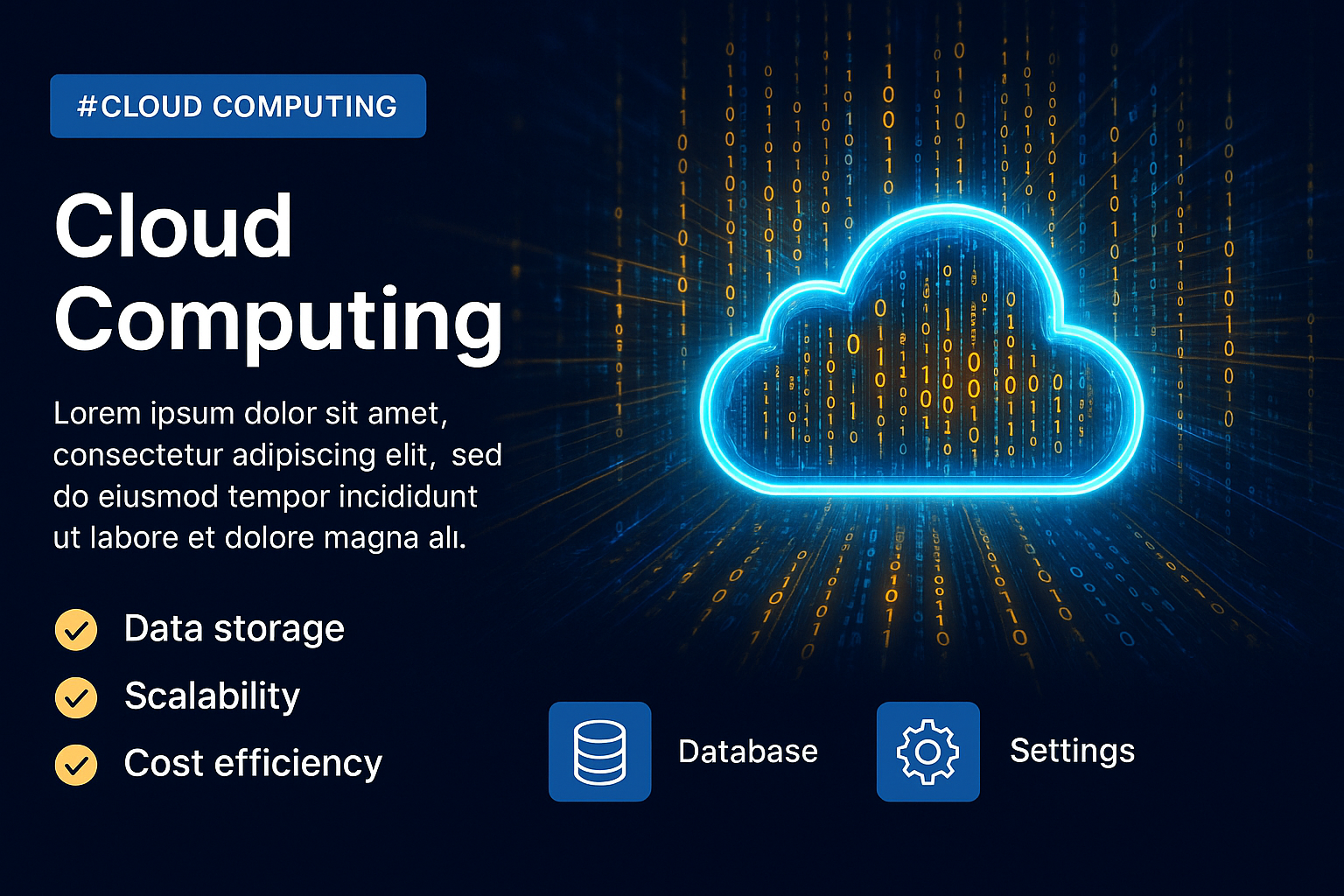 Digital graphic showcasing cloud computing concepts with blue neon elements and binary code background. Ideal for tech presentations and marketing materials.