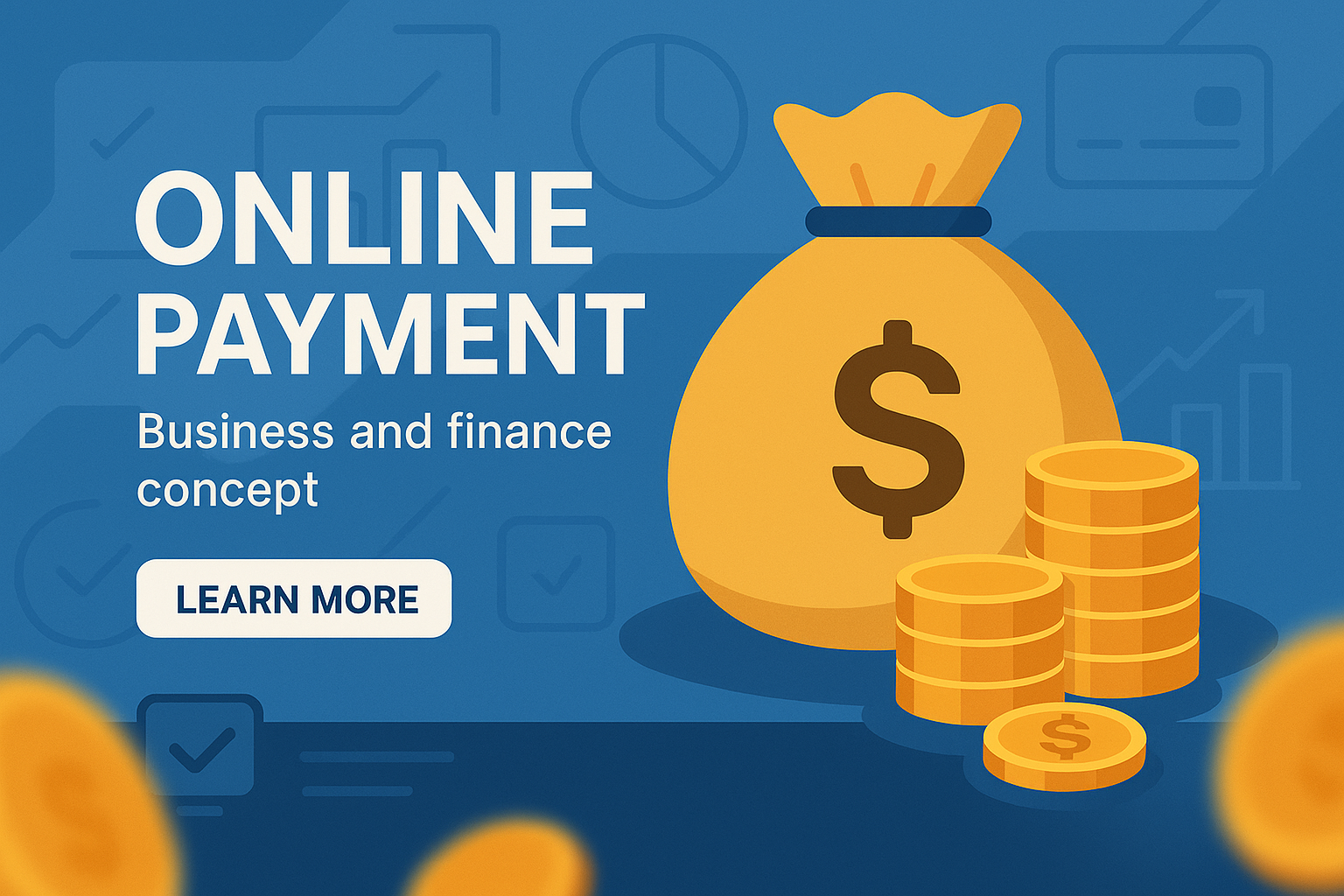 Illustrative graphic depicting the concept of online payments, featuring a money bag and coins, designed for financial services or e-commerce marketing.