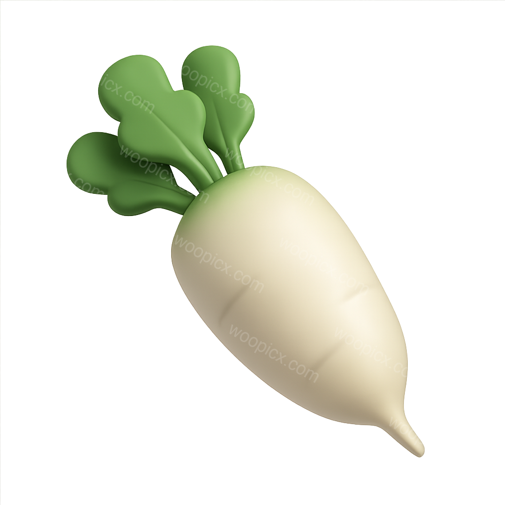 A stylized 3D icon of a daikon radish featuring a smooth, volumetric design. The radish is depicted in a three-quarter view with vibrant green leaves, set against a soft gradient background.