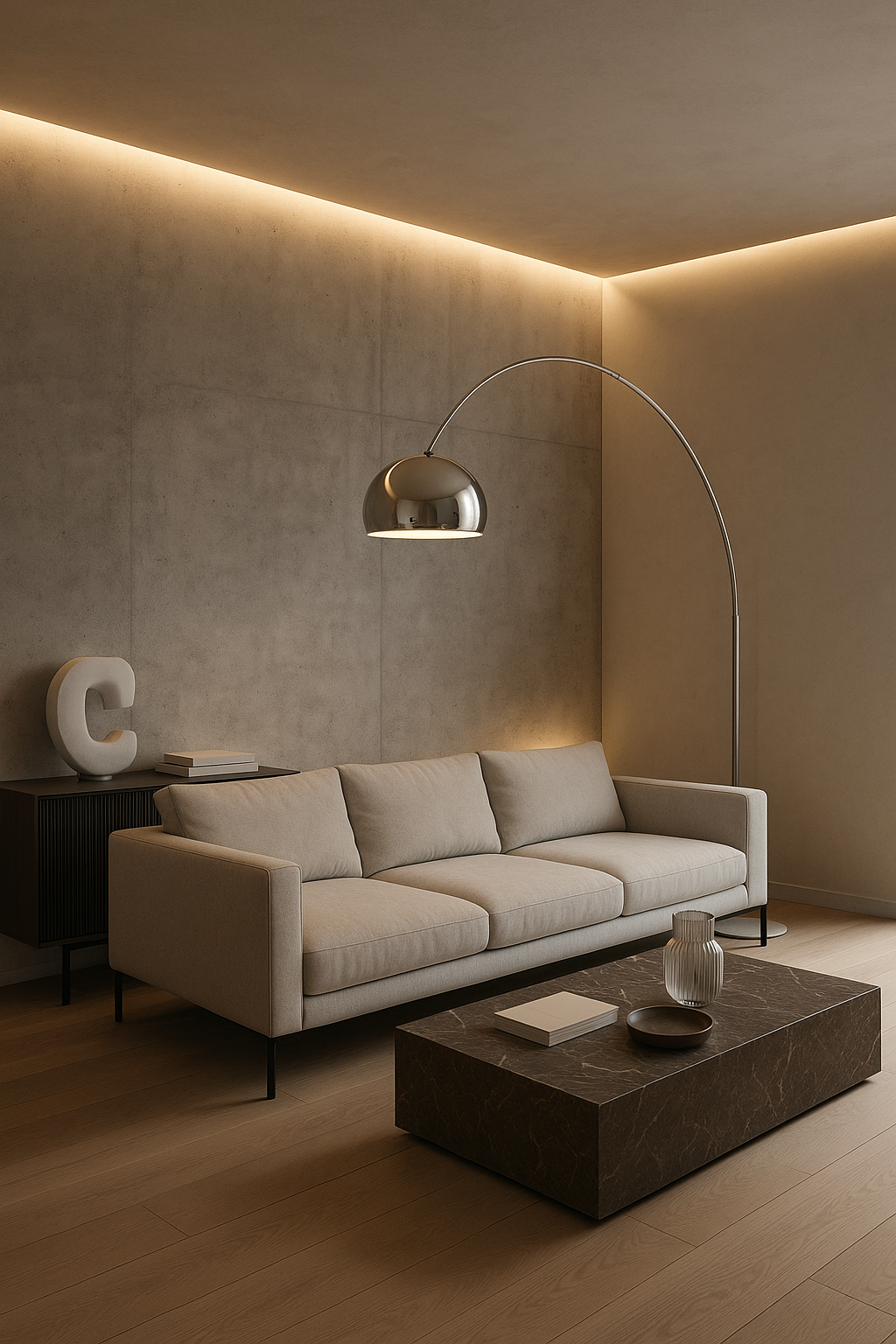 A sleek, modern living room featuring a soft-lit atmosphere with a concrete wall, a stylish sofa, and an elegant arc lamp. The decor includes a chic coffee table and minimalist accents.