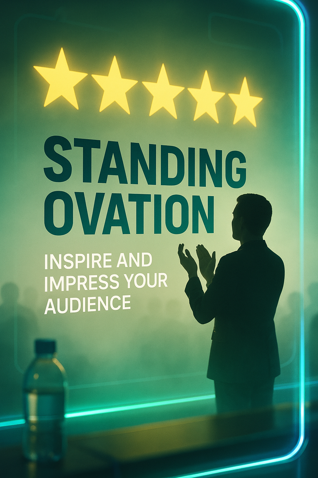 /Collection: /by davooda/Type: PNG/Dynamic image featuring a silhouette of a person applauding with a glowing five-star rating and motivational text, ideal for presentations or promotional materials.