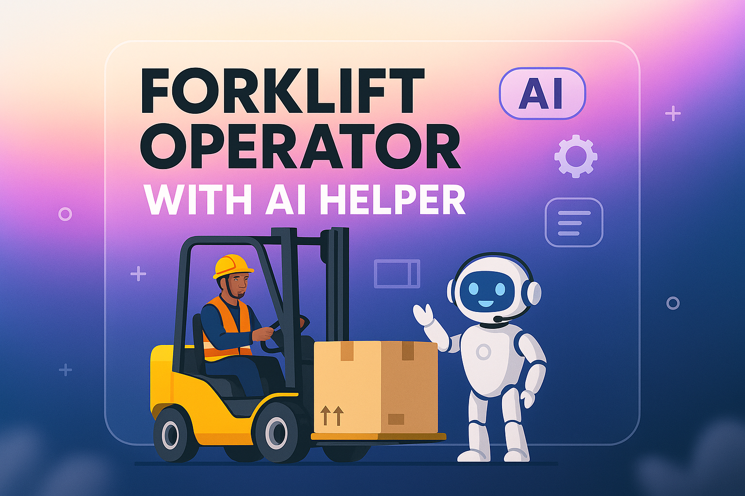 /Collection: /by davooda/Type: PNG/A vibrant illustration of a forklift operator and an AI helper, featuring a layered design with a gradient background. The scene highlights teamwork between technology and human labor.