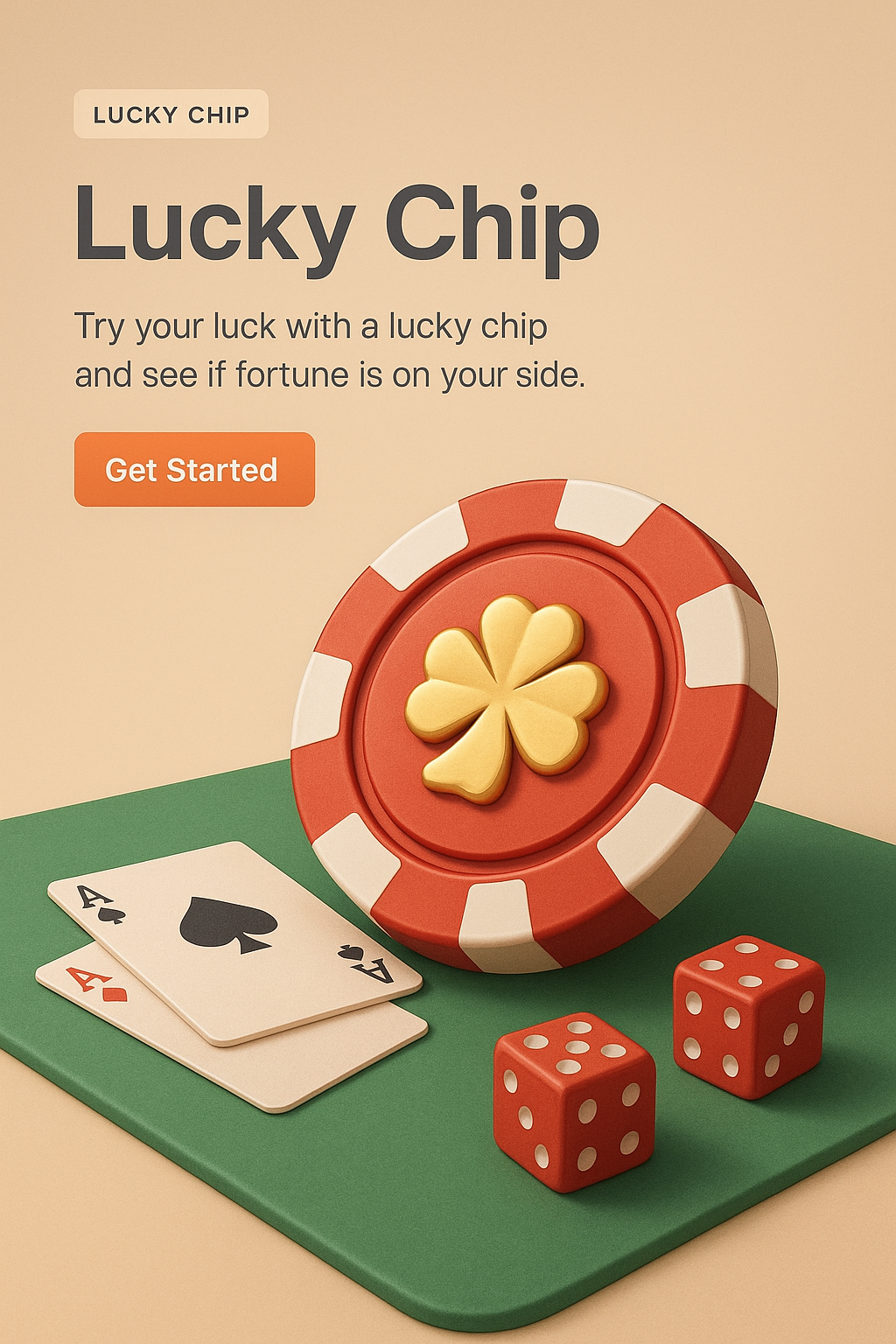 A zoomed-out 3D illustration featuring a lucky chip, playing cards, and dice on a green surface, emphasizing a gaming theme with a cohesive design.