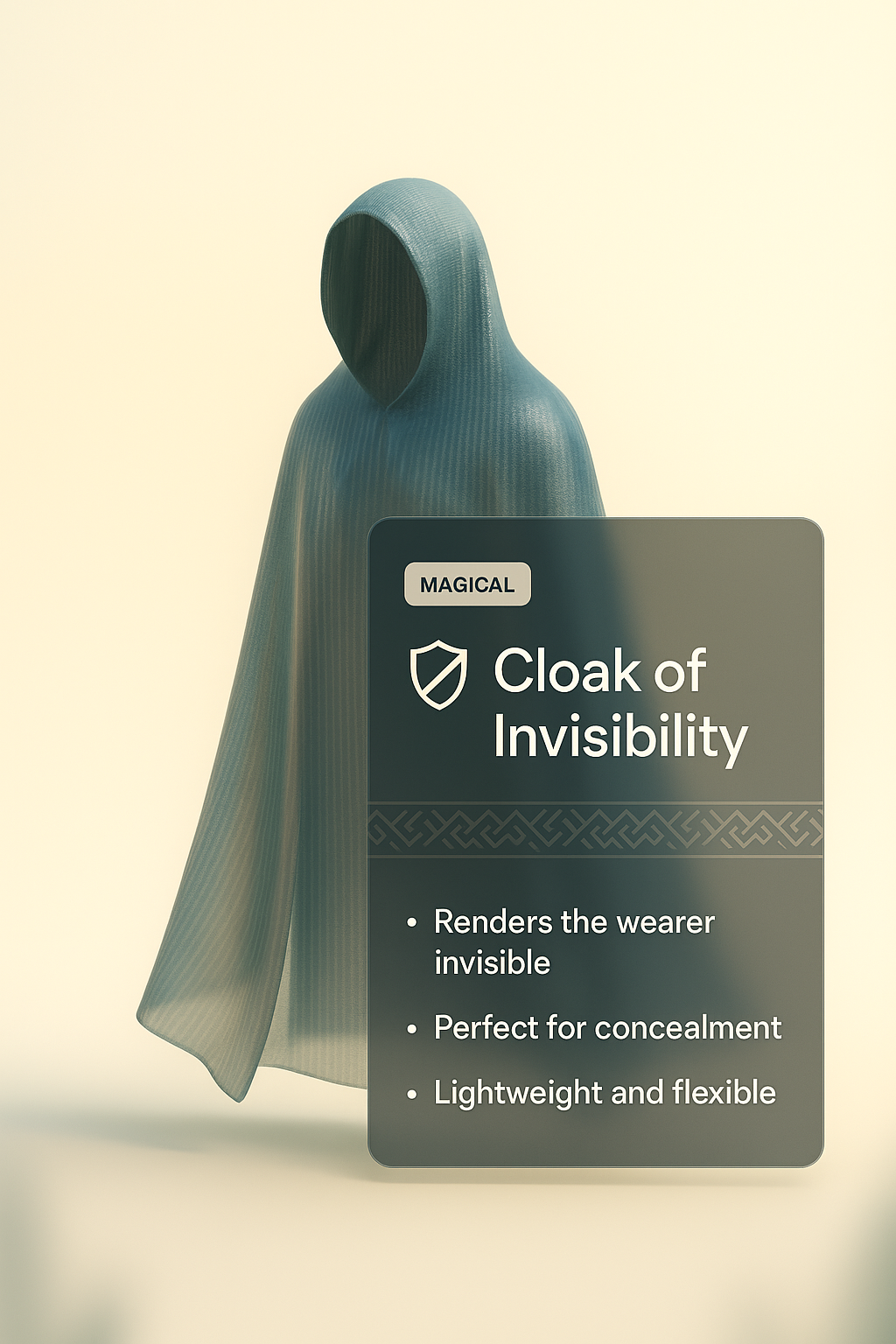 /Collection: /by davooda/Type: PNG/A beautifully designed 3D illustration of a cloak of invisibility, featuring a translucent texture. An integrated info panel highlights its magical properties and uses.