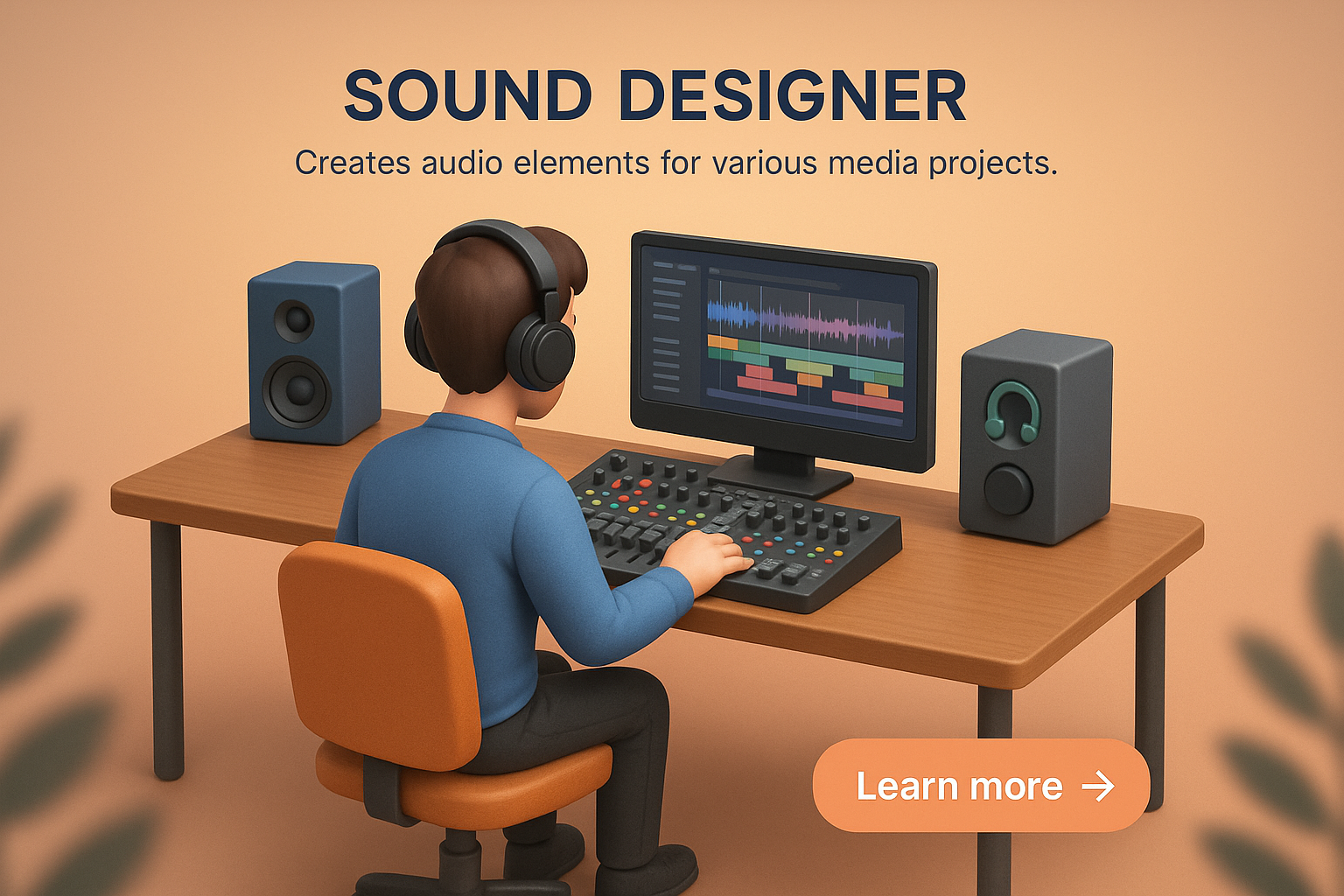 /Collection: /by davooda/Type: PNG/A 3D illustration depicts a sound designer working at a desk with audio equipment. The scene features a vibrant gradient background and clear text elements for a cohesive design.