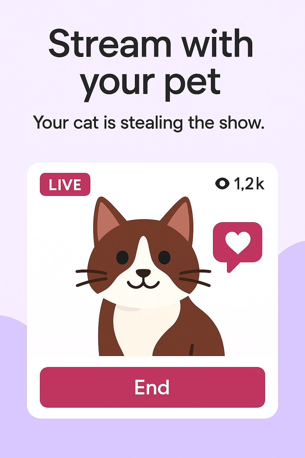 Playful illustration of a cat in a social media live stream layout, designed for engaging pet-related content. Ideal for promoting pet streaming activities.