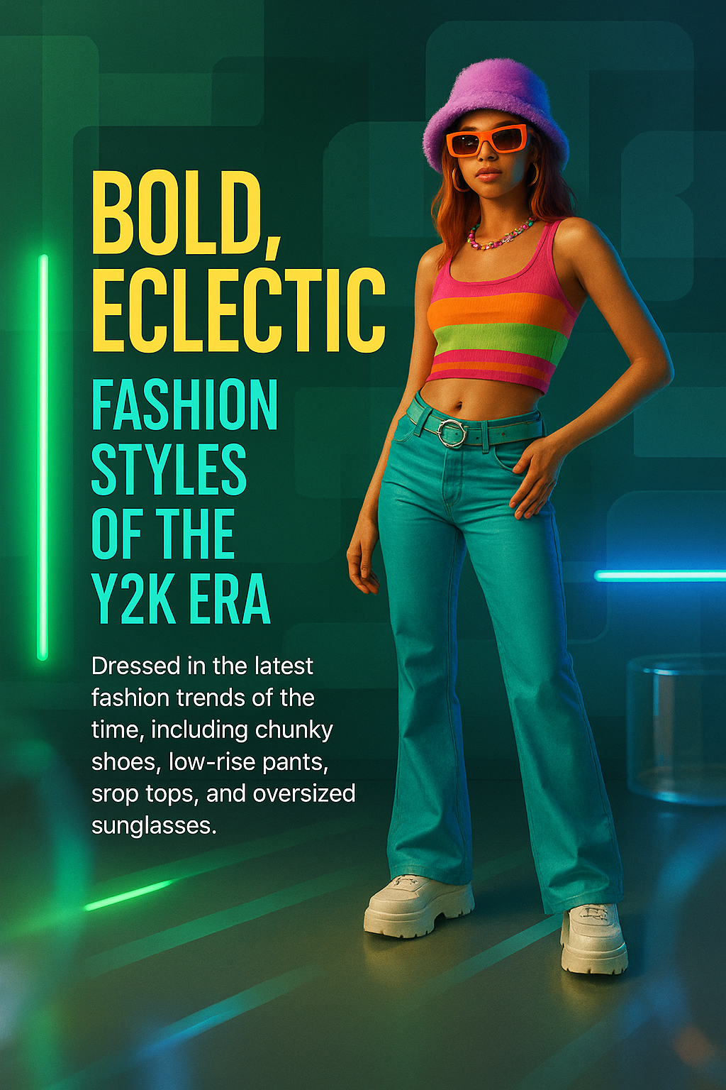 Vibrant fashion promotional image showcasing bold Y2K era styles, perfect for targeting a youthful audience interested in retro trends.