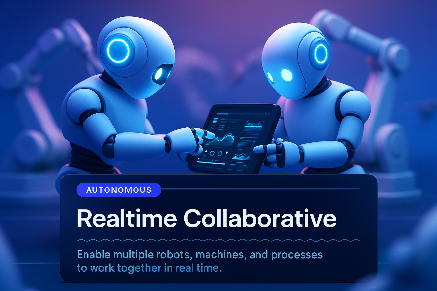 The image showcases two futuristic robots collaborating on a tablet, surrounded by automated machinery. The design highlights a sleek, digital workspace emphasizing teamwork in a high-tech environment.