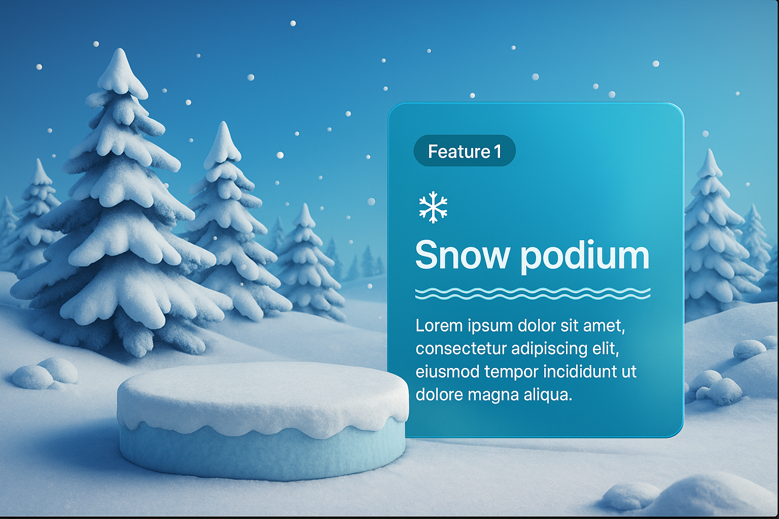 /Collection: /by davooda/Type: PNG/A serene winter landscape featuring a snow-covered podium, surrounded by frosted trees and a soft blue gradient sky. A product placement block is integrated seamlessly into the scene.