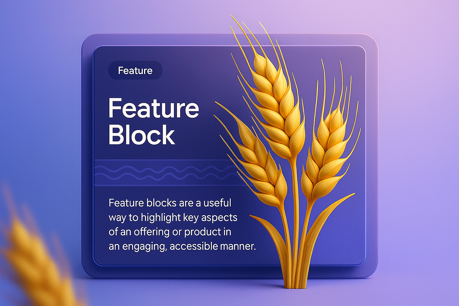 A visually appealing feature block showcases golden wheat ears against a smooth gradient background, emphasizing design elements with a modern touch.