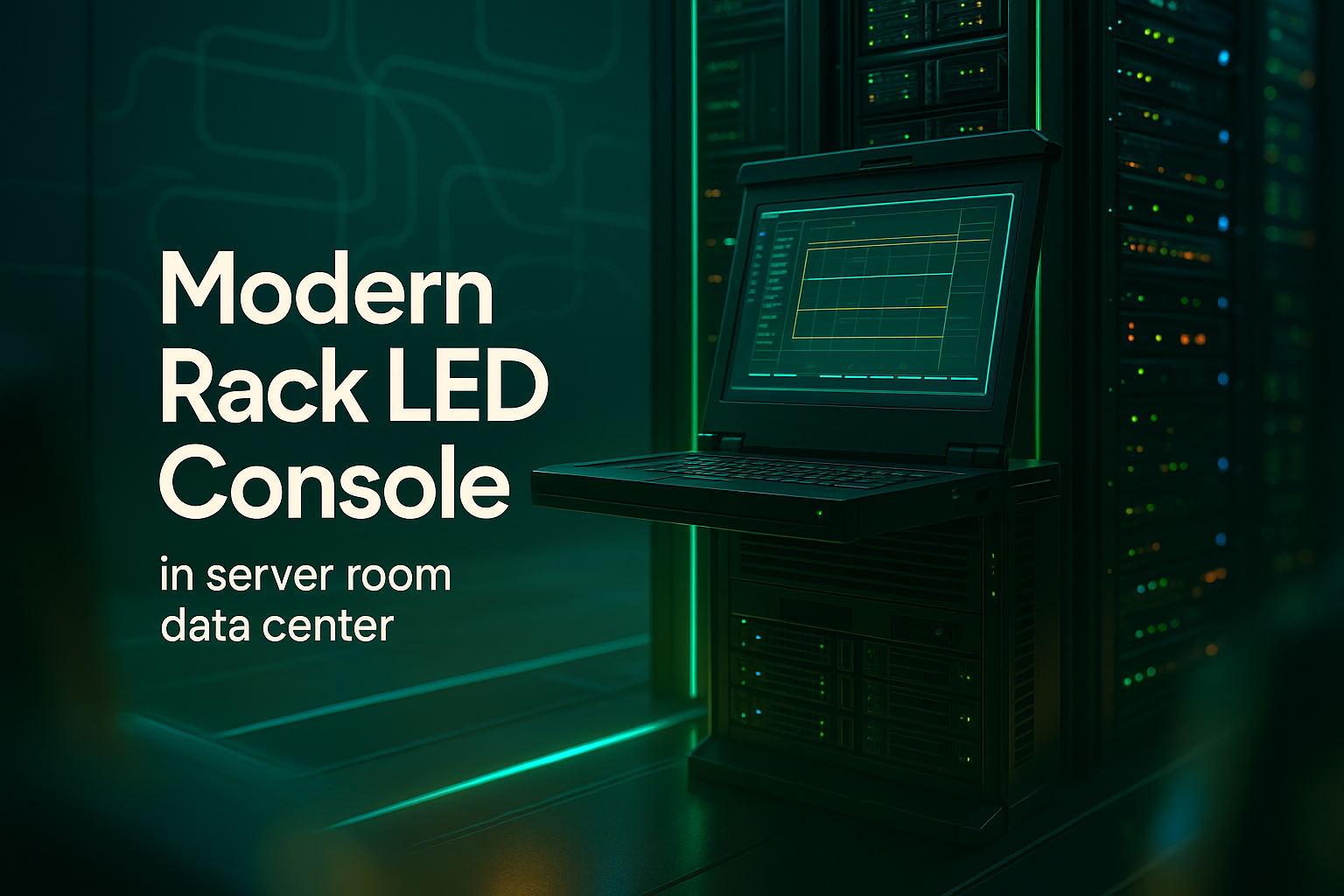 Image of a modern rack-mounted LED console set within a server room. The design features a sleek and futuristic aesthetic, highlighting technology and data management, ideal for tech industry presentations.