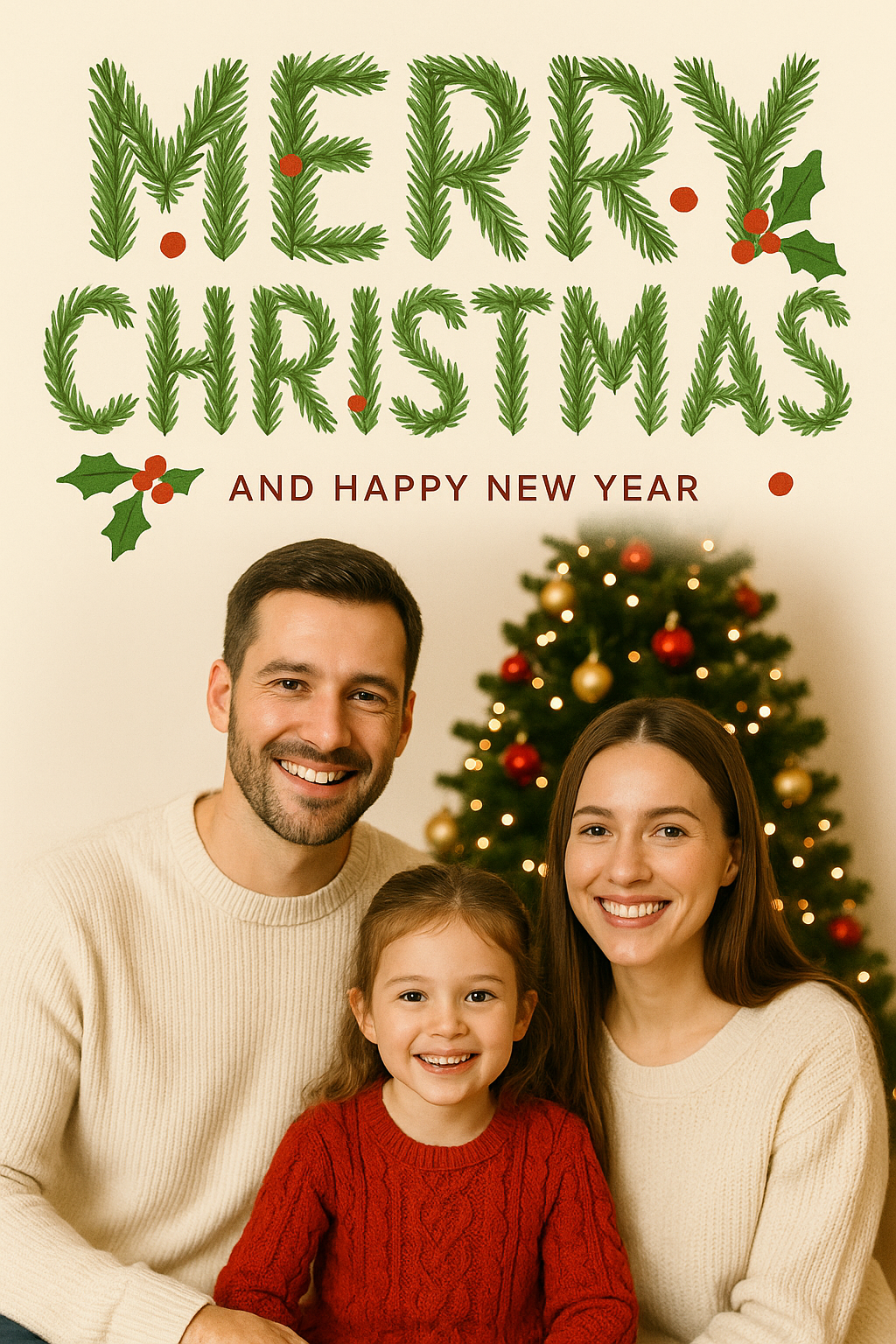 /Collection: /by davooda/Type: PNG/A warm and festive family portrait featuring a couple and their child, celebrating Christmas and New Year. The image showcases holiday decorations and a joyful atmosphere, ideal for seasonal greetings.