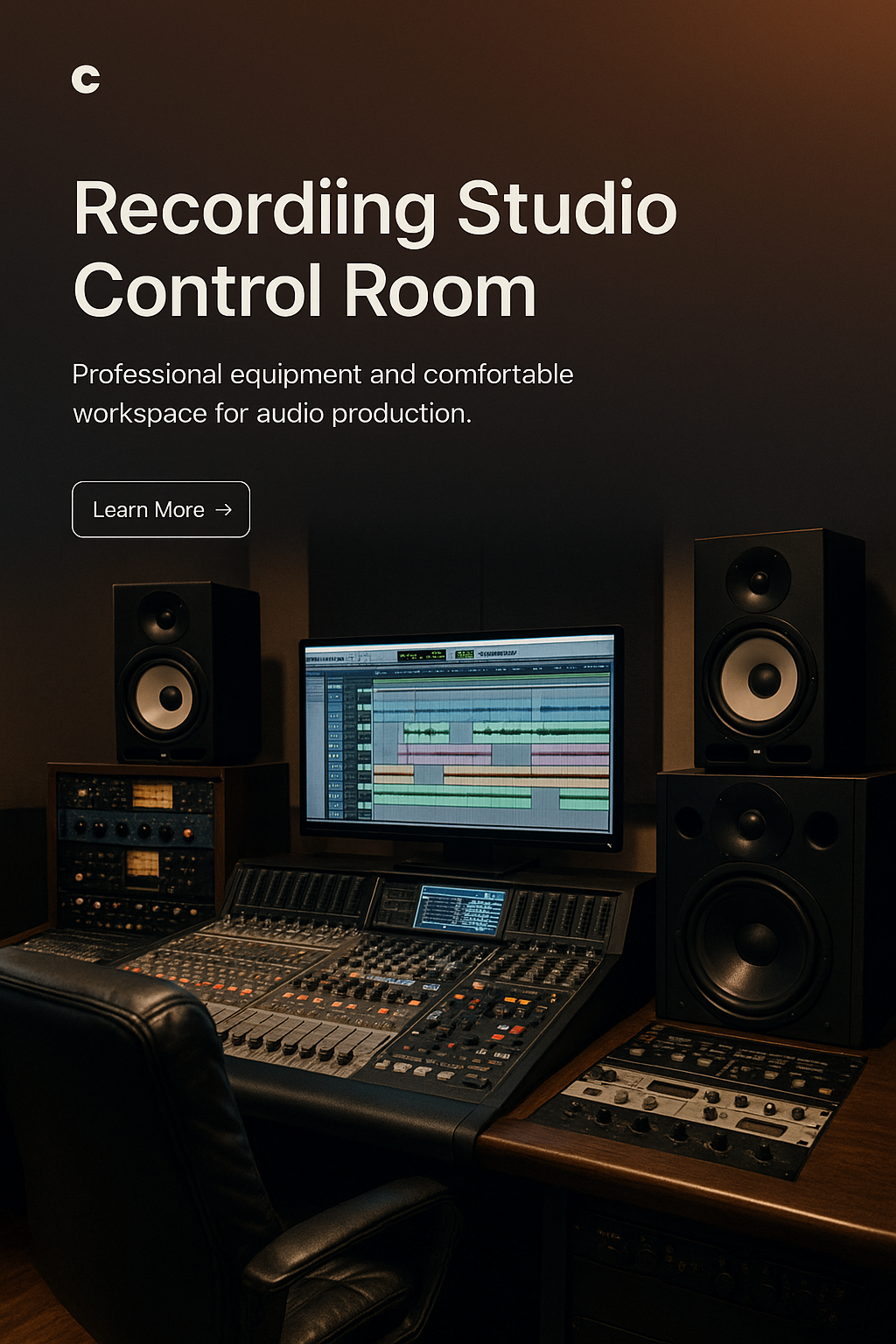 A sleek recording studio control room featuring professional audio equipment. The design includes a mixing console, monitors, and an inviting workspace for music production.