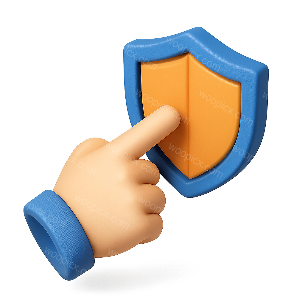 /Premium/Collection: /by davooda/Type: PNG/A 3D icon featuring a hand pointing at a shield, designed in a volumetric, isometric style with a transparent background. The shield has a blue border and an orange center.