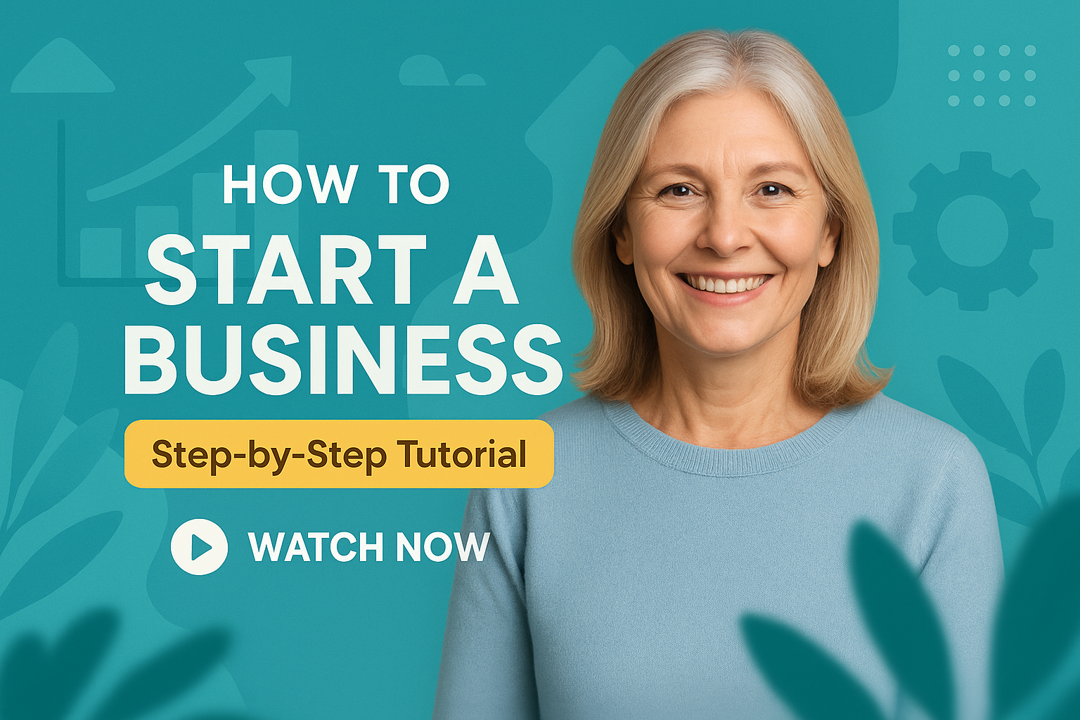/Collection: /by davooda/Type: PNG/Promotional banner designed to attract viewers to a step-by-step business startup tutorial. Features a welcoming portrait and vibrant background, perfect for social media engagement.
