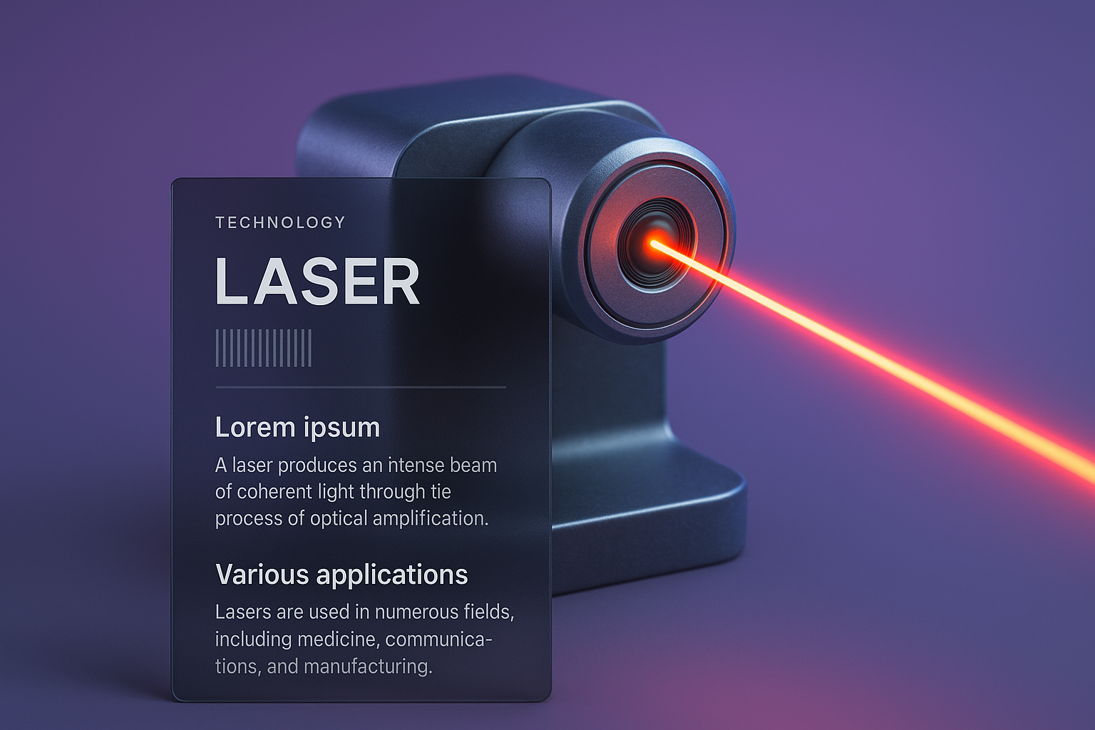 /Collection: /by davooda/Type: PNG/A 3D illustration of a laser device emitting a vibrant red beam on a smooth gradient background. Informative blocks are seamlessly integrated, featuring technology details.
