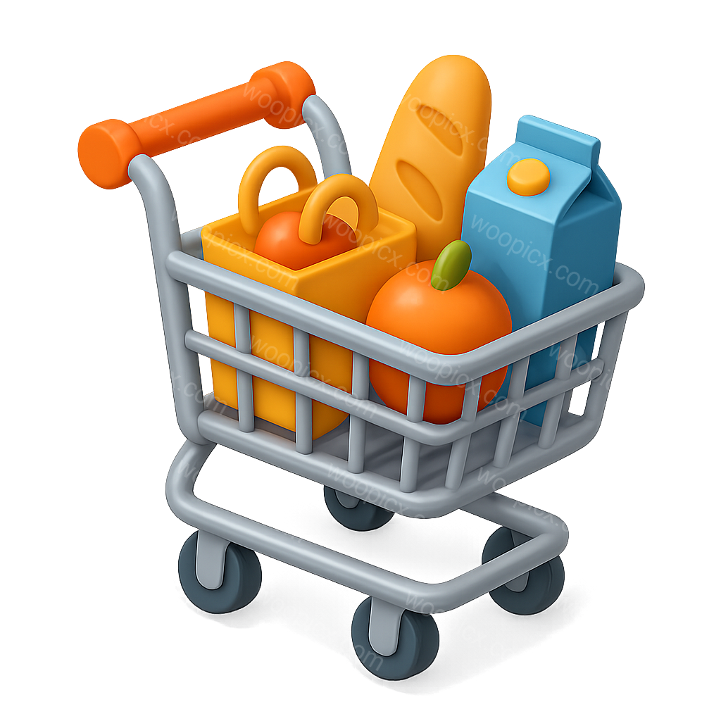/Premium/Collection: /by davooda/Type: PNG/A colorful 3D shopping cart filled with groceries including a loaf of bread, a carton of milk, an orange, and a small box. The cart has a transparent background and a three-quarter view, showcasing a volumetric design.