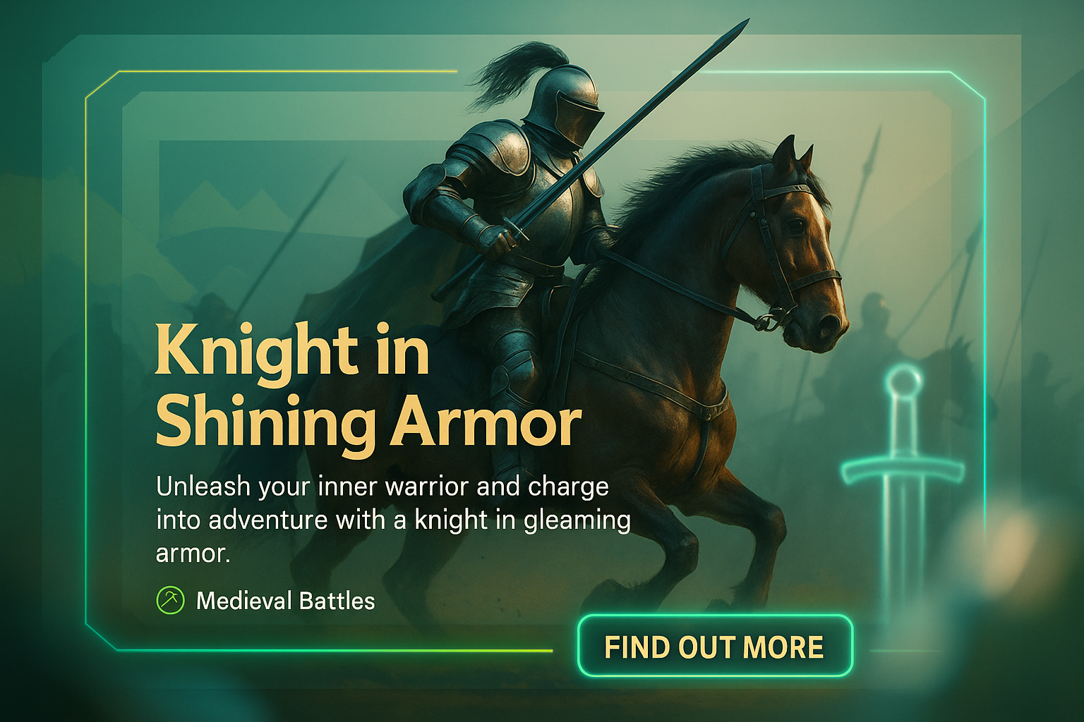/Collection: /by davooda/Type: PNG/Dynamic promotional graphic featuring a knight in shining armor on horseback, designed for a gaming adventure theme. Ideal for engaging audiences in medieval battle games.